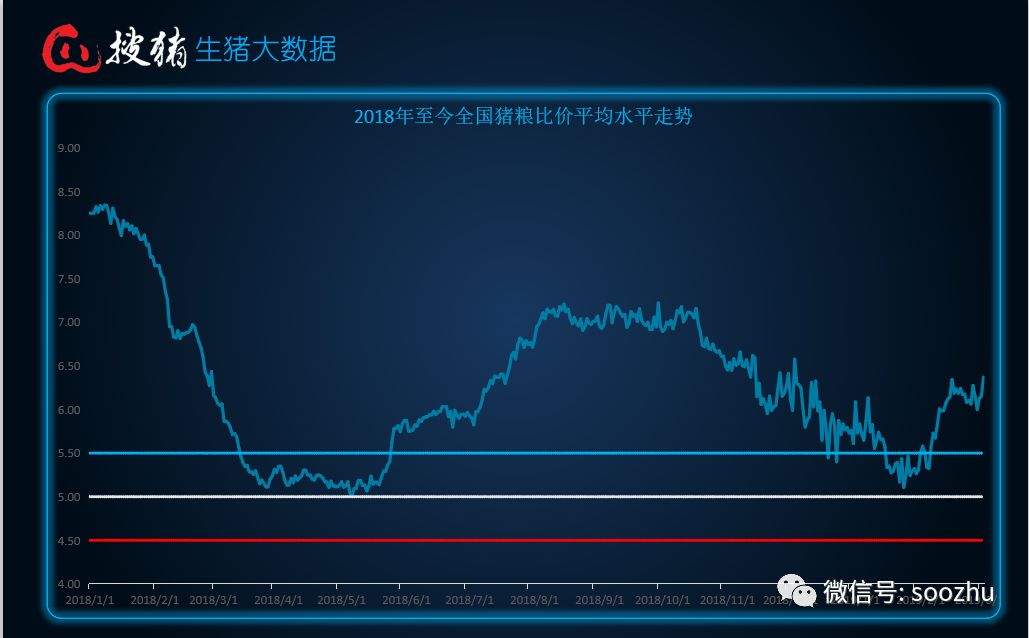 全国猪粮比价,在原料成本玉米价格变化不大的前提下,维持在6.5:1的水平!