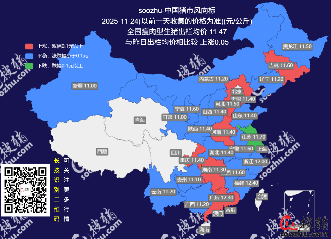 11月24日评:今日全国瘦肉型猪出栏均价11.47元/公斤
