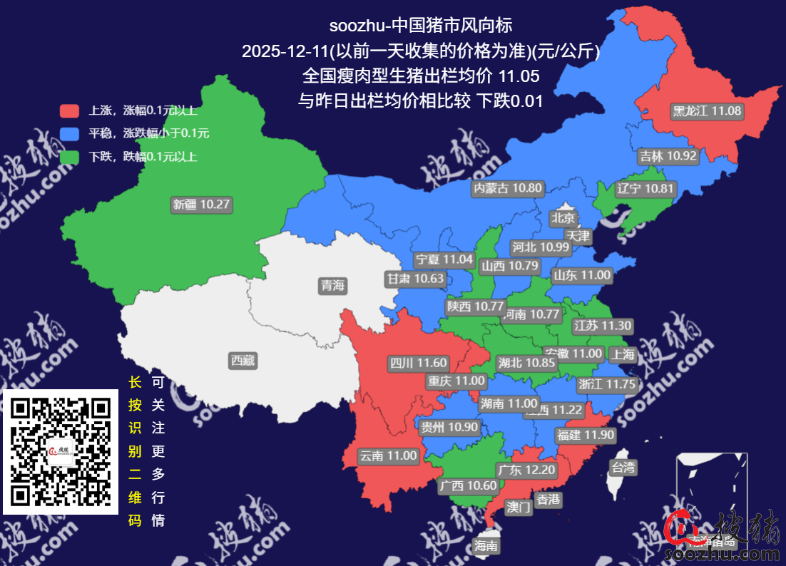 12月11日评:今日全国瘦肉型猪出栏均价11.05元/公斤