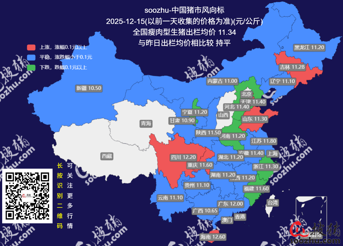12月15日评:今日全国瘦肉型猪出栏均价11.34元/公斤