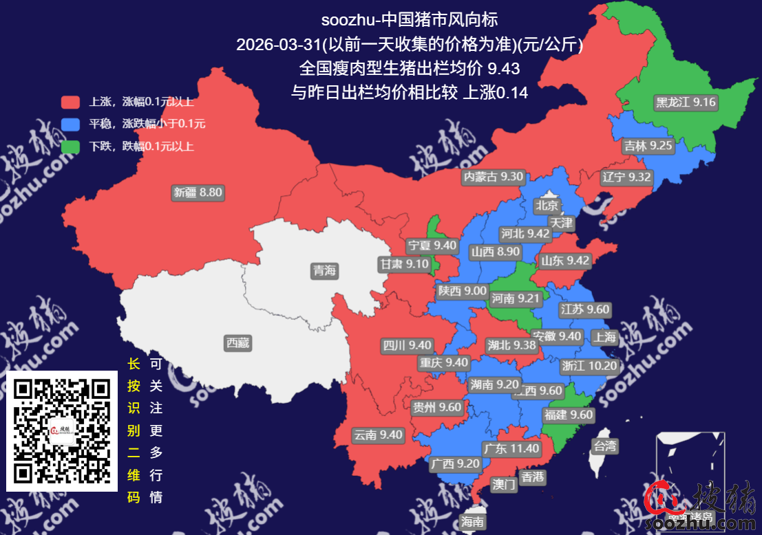 3月31日评:今日全国瘦肉型猪出栏均价9.43元/公斤