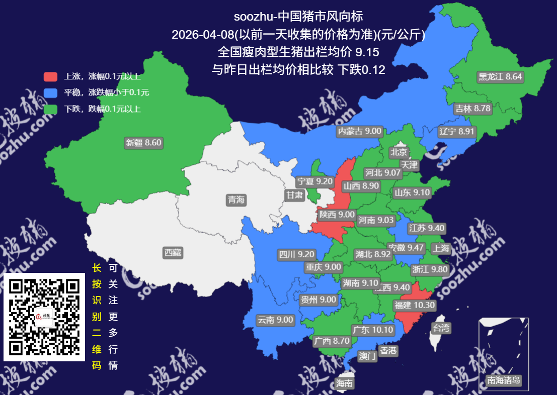 今日(2026 年 4 月 8 日),搜猪网最新监测显示,全国瘦肉型生猪出栏均价9.05 元 / 公斤,较 4 月 7 日下跌 0.10 元[详情]