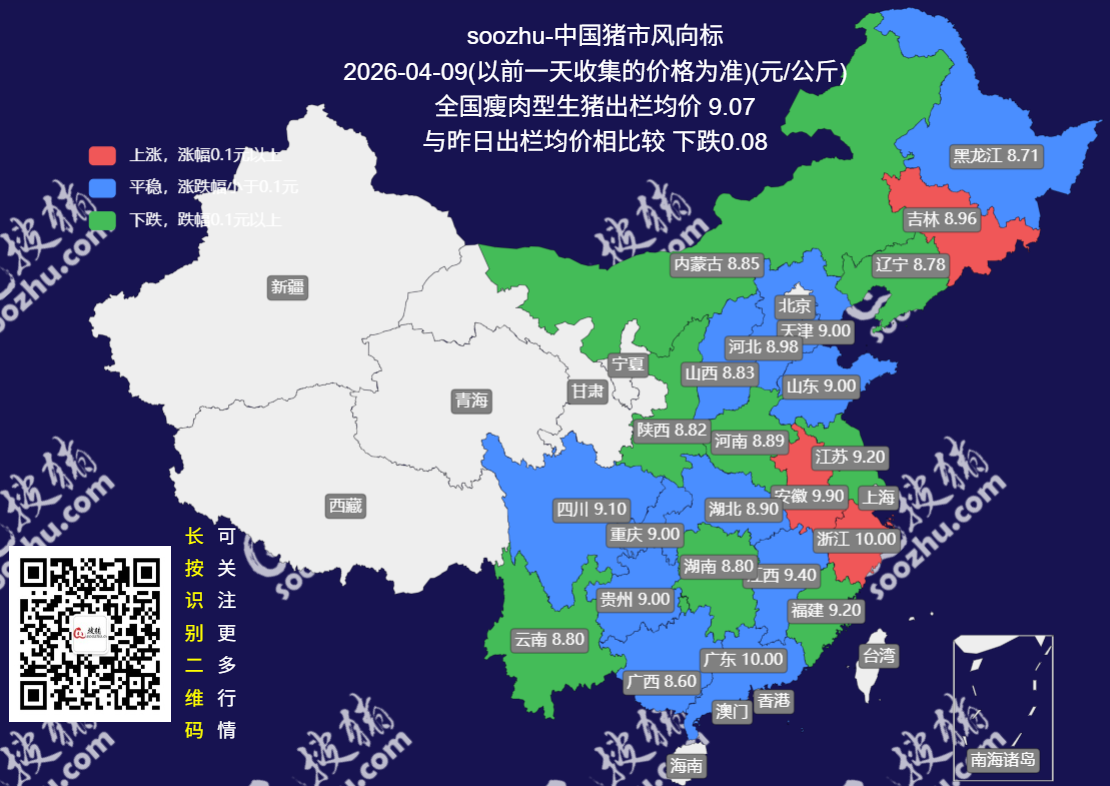 今日(2026 年 4 月 9 日),搜猪网最新监测显示,全国瘦肉型生猪出栏均价 9.07 元 / 公斤,较 4 月 8 日下跌 0.08 [详情]