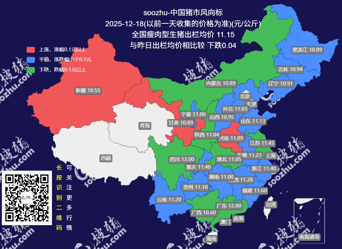 今日全国瘦肉型猪出栏均价11.15元/公斤,较昨日下跌了0.04元/公斤[详情]