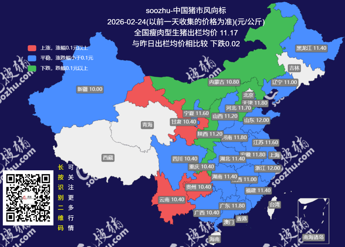 今日全国瘦肉型猪出栏均价11.17元/公斤,较昨日下跌了0.02元/公斤[详情]