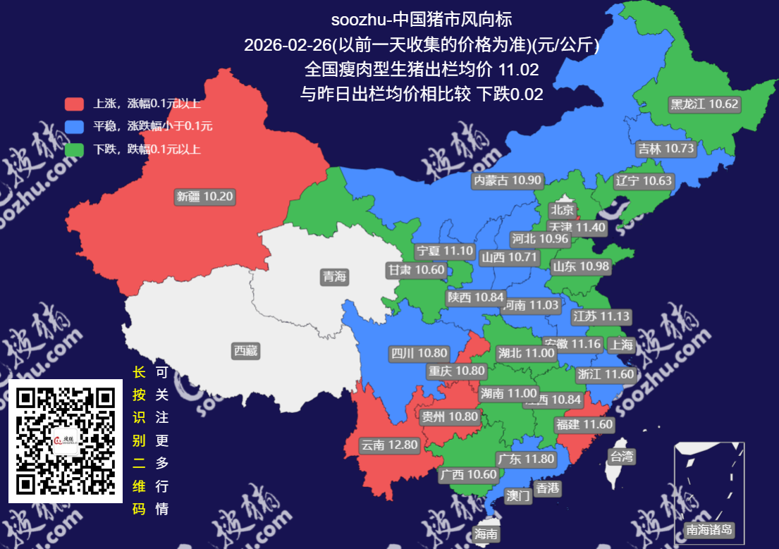 今日全国瘦肉型猪出栏均价11.02元/公斤,较昨日下跌了0.02元/公斤[详情]