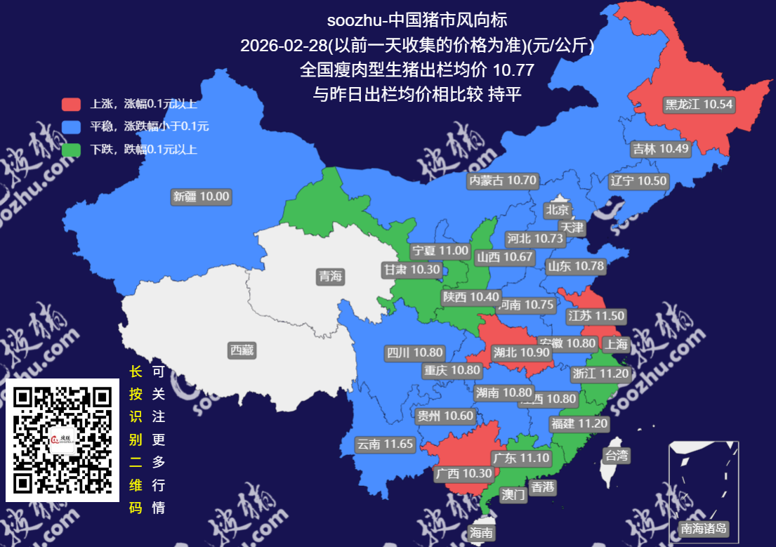 今日全国瘦肉型猪出栏均价10.77元/公斤,与昨日持平[详情]