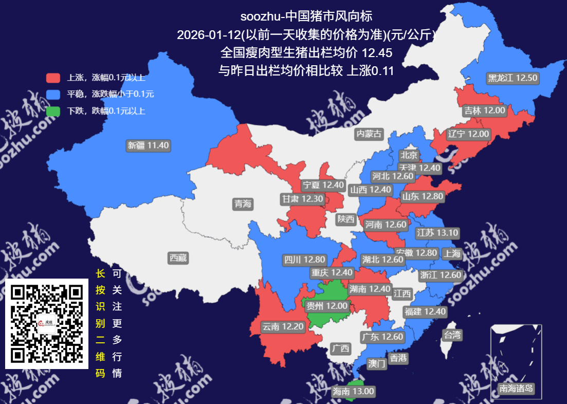1月12日生猪日报:今日全国瘦肉型猪出栏均价12.45元/公斤