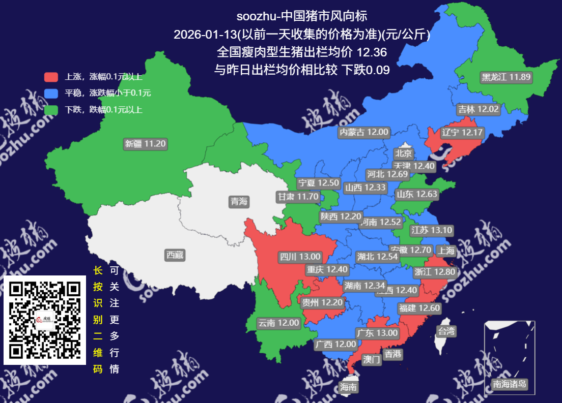 1月13日评:今日全国瘦肉型猪出栏均价12.36元/公斤
