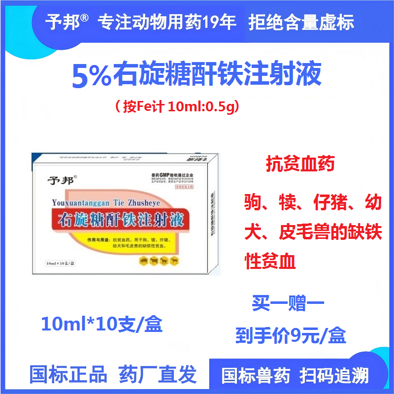 【予邦】5%右旋糖酐铁注射液10ml*10支 兽药 国标可追溯 缺铁性贫血仔猪补铁猪牛羊马犬毛皮兽可用